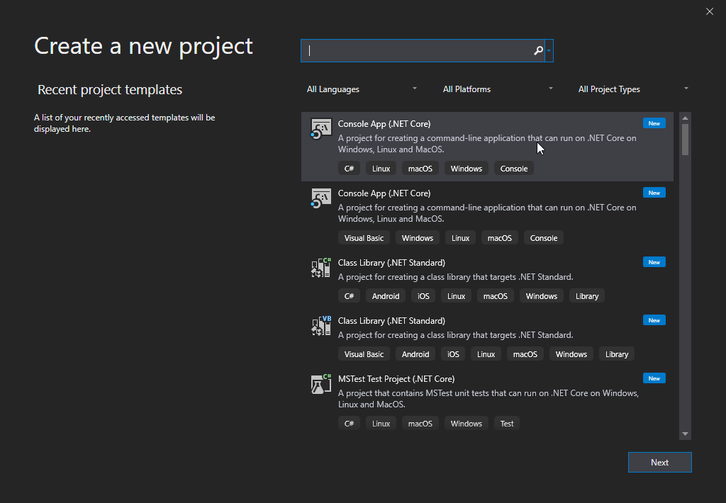 从列表中选择控制台应用程序 (.NET Core),然后单击“下一步”按钮: