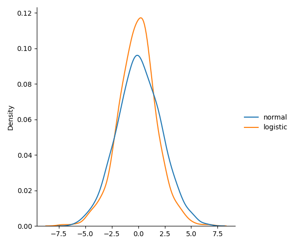 对于较高的标准差(scale)值,除了峰值以外,正态分布和逻辑分布几乎完全相同。