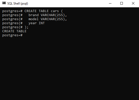 执行上述语句后,将创建一个名为 cars 的空表,SQL Shell 应用程序将返回以下内容: