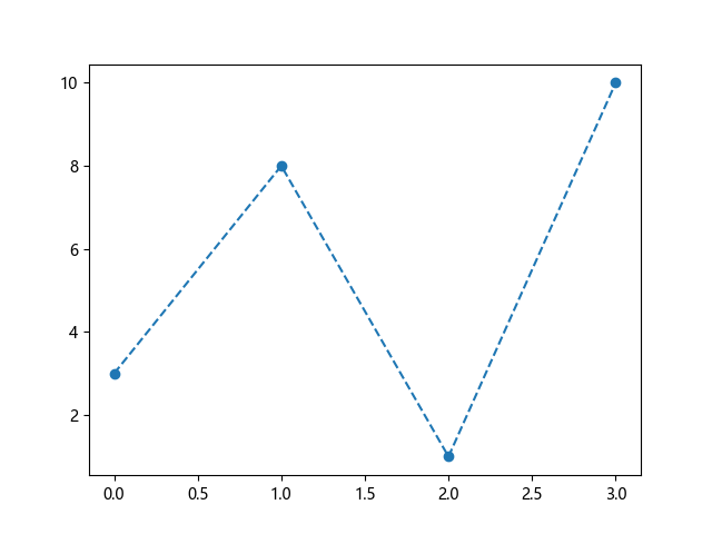 # 这三行代码使编译器能够绘图: import sys import matplotlib matplotlib.use('Agg') import matplotlib.pyplot as plt import numpy as np ypoints = np.array([3, 8, 1, 10]) # 使用圆形标记和虚线样式绘制 plt.plot(ypoints, 'o--') plt.show() # 这两行代码使编译器能够输出图形: plt.savefig(sys.stdout.buffer) sys.stdout.flush()