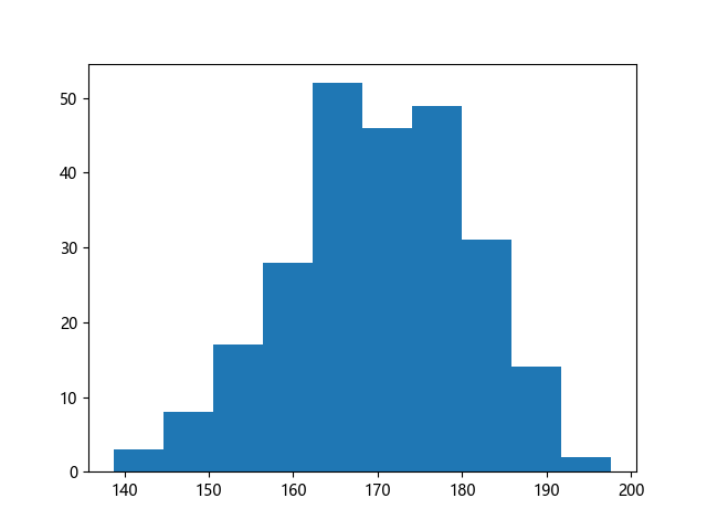 # 以下三行代码使编译器支持绘图功能: import sys import matplotlib matplotlib.use('Agg') import matplotlib.pyplot as plt import numpy as np # 生成正态分布数据: x = np.random.normal(170, 10, 250) # 均值 170,标准差 10,250 个数据点 # 绘制直方图: plt.hist(x) # 创建直方图 plt.show() # 显示图表 # 以下两行代码使编译器能够输出图形: plt.savefig(sys.stdout.buffer) sys.stdout.flush()