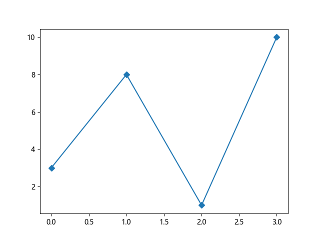 # 这三行代码使编译器能够绘图: import sys import matplotlib matplotlib.use('Agg') import matplotlib.pyplot as plt import numpy as np ypoints = np.array([3, 8, 1, 10]) # 使用大号菱形标记绘制 plt.plot(ypoints, marker = 'D') plt.show() # 这两行代码使编译器能够输出图形: plt.savefig(sys.stdout.buffer) sys.stdout.flush()