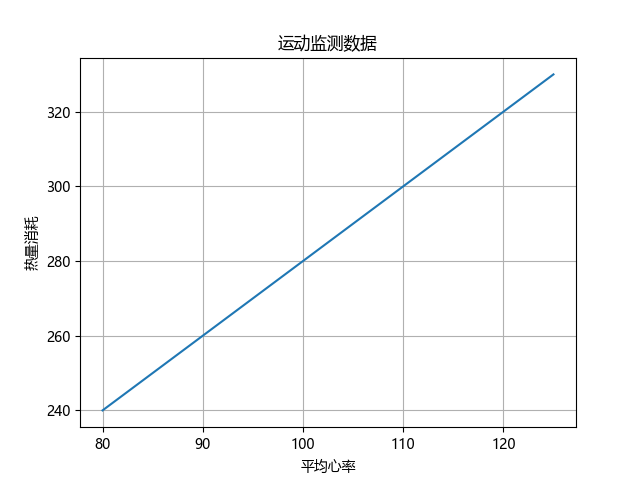 # 这三行代码使编译器能够绘图: import sys import matplotlib matplotlib.use('Agg') import numpy as np import matplotlib.pyplot as plt # 准备运动数据(心率和卡路里): x = np.array([80, 85, 90, 95, 100, 105, 110, 115, 120, 125]) y = np.array([240, 250, 260, 270, 280, 290, 300, 310, 320, 330]) plt.title("运动监测数据") # 设置图表标题 plt.xlabel("平均心率") # 设置 X 轴标签 plt.ylabel("热量消耗") # 设置 Y 轴标签 plt.plot(x, y) # 绘制心率 - 热量消耗曲线 plt.grid() # 显示网格线(默认 X/Y 轴都显示) plt.show() # 这两行代码使编译器能够输出图形: plt.savefig(sys.stdout.buffer) sys.stdout.flush()