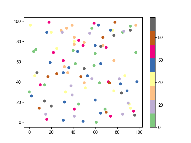 # 这三行代码使编译器能够绘图: import sys import matplotlib matplotlib.use('Agg') import matplotlib.pyplot as plt import numpy as np x = np.random.randint(100, size=(100)) y = np.random.randint(100, size=(100)) colors = np.random.randint(100, size=(100)) # 使用强调色系绘制散点图: plt.scatter(x, y, c=colors, cmap='Accent') plt.colorbar() plt.show() # 这两行代码使编译器能够输出图形: plt.savefig(sys.stdout.buffer) sys.stdout.flush()