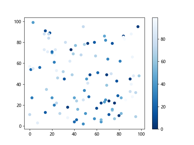 # 这三行代码使编译器能够绘图: import sys import matplotlib matplotlib.use('Agg') import matplotlib.pyplot as plt import numpy as np x = np.random.randint(100, size=(100)) y = np.random.randint(100, size=(100)) colors = np.random.randint(100, size=(100)) # 使用反向蓝色渐变绘制散点图: plt.scatter(x, y, c=colors, cmap='Blues_r') plt.colorbar() # 显示颜色条 plt.show() # 显示图形 # 这两行代码使编译器能够输出图形: plt.savefig(sys.stdout.buffer) sys.stdout.flush()