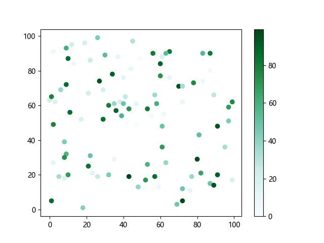 # 这三行代码使编译器能够绘图: import sys import matplotlib matplotlib.use('Agg') import matplotlib.pyplot as plt import numpy as np x = np.random.randint(100, size=(100)) y = np.random.randint(100, size=(100)) colors = np.random.randint(100, size=(100)) # 使用蓝绿色渐变绘制散点图: plt.scatter(x, y, c=colors, cmap='BuGn') plt.colorbar() # 显示颜色条 plt.show() # 显示图形 # 这两行代码使编译器能够输出图形: plt.savefig(sys.stdout.buffer) sys.stdout.flush()
