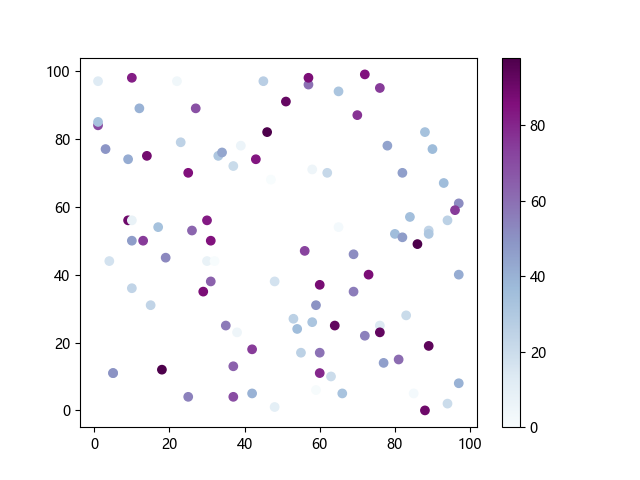 # 这三行代码使编译器能够绘图: import sys import matplotlib matplotlib.use('Agg') import matplotlib.pyplot as plt import numpy as np x = np.random.randint(100, size=(100)) y = np.random.randint(100, size=(100)) colors = np.random.randint(100, size=(100)) # 使用蓝紫色渐变绘制散点图: plt.scatter(x, y, c=colors, cmap='BuPu') plt.colorbar() # 显示颜色条 plt.show() # 显示图形 # 这两行代码使编译器能够输出图形: plt.savefig(sys.stdout.buffer) sys.stdout.flush()