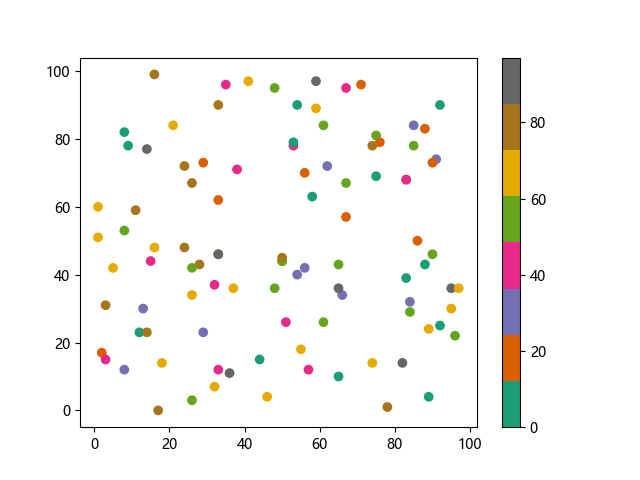# 这三行代码使编译器能够绘图: import sys import matplotlib matplotlib.use('Agg') import matplotlib.pyplot as plt import numpy as np x = np.random.randint(100, size=(100)) y = np.random.randint(100, size=(100)) colors = np.random.randint(100, size=(100)) # 使用 Dark2 配色方案绘制散点图: plt.scatter(x, y, c=colors, cmap='Dark2') plt.colorbar() plt.show() # 这两行代码使编译器能够输出图形: plt.savefig(sys.stdout.buffer) sys.stdout.flush()