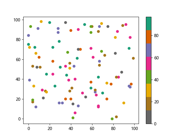 # 这三行代码使编译器能够绘图: import sys import matplotlib matplotlib.use('Agg') import matplotlib.pyplot as plt import numpy as np x = np.random.randint(100, size=(100)) y = np.random.randint(100, size=(100)) colors = np.random.randint(100, size=(100)) # 使用反向 Dark2 配色方案绘制散点图: plt.scatter(x, y, c=colors, cmap='Dark2_r') plt.colorbar() plt.show() # 这两行代码使编译器能够输出图形: plt.savefig(sys.stdout.buffer) sys.stdout.flush()