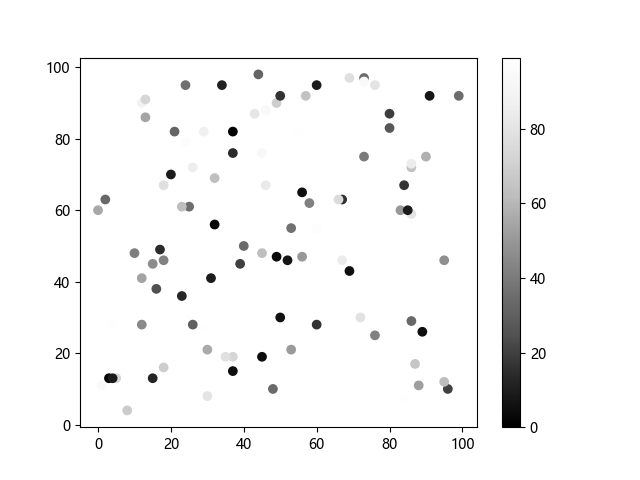 # 这三行代码使编译器能够绘图: import sys import matplotlib matplotlib.use('Agg') import matplotlib.pyplot as plt import numpy as np x = np.random.randint(100, size=(100)) y = np.random.randint(100, size=(100)) colors = np.random.randint(100, size=(100)) # 使用反向灰度渐变绘制散点图: plt.scatter(x, y, c=colors, cmap='Greys_r') plt.colorbar() plt.show() # 这两行代码使编译器能够输出图形: plt.savefig(sys.stdout.buffer) sys.stdout.flush()