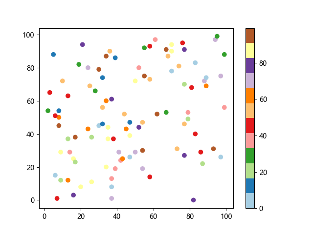 # 这三行代码使编译器能够绘图: import sys import matplotlib matplotlib.use('Agg') import matplotlib.pyplot as plt import numpy as np x = np.random.randint(100, size=(100)) y = np.random.randint(100, size=(100)) colors = np.random.randint(100, size=(100)) # 使用配对色系绘制散点图: plt.scatter(x, y, c=colors, cmap='Paired') plt.colorbar() plt.show() # 这两行代码使编译器能够输出图形: plt.savefig(sys.stdout.buffer) sys.stdout.flush()