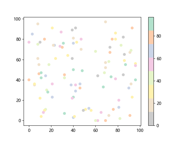 # 这三行代码使编译器能够绘图: import sys import matplotlib matplotlib.use('Agg') import matplotlib.pyplot as plt import numpy as np # 生成 100 个随机 x 坐标: x = np.random.randint(100, size=(100)) # 生成 100 个随机 y 坐标: y = np.random.randint(100, size=(100)) # 生成 100 个随机颜色值: colors = np.random.randint(100, size=(100)) # 绘制彩色散点图 plt.scatter(x, y, c=colors, cmap='Pastel2_r') plt.colorbar() # 显示颜色条 plt.show() # 显示图形 # 这两行代码使编译器能够输出图形: plt.savefig(sys.stdout.buffer) sys.stdout.flush()