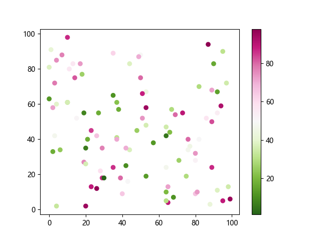 # 这三行代码使编译器能够绘图: import sys import matplotlib matplotlib.use('Agg') import matplotlib.pyplot as plt import numpy as np # 生成随机数据: x = np.random.randint(100, size=(100)) y = np.random.randint(100, size=(100)) colors = np.random.randint(100, size=(100)) # 使用 PiYG_r 配色方案绘制粉绿反向渐变色散点图: plt.scatter(x, y, c=colors, cmap='PiYG_r') plt.colorbar() # 显示颜色条 plt.show() # 显示图形 # 这两行代码使编译器能够输出图形: plt.savefig(sys.stdout.buffer) sys.stdout.flush()