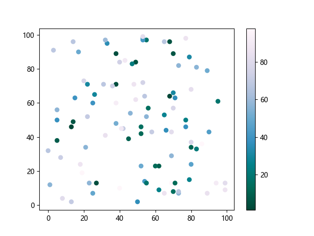 # 这三行代码使编译器能够绘图: import sys import matplotlib matplotlib.use('Agg') import matplotlib.pyplot as plt import numpy as np # 生成随机数据: x = np.random.randint(100, size=(100)) y = np.random.randint(100, size=(100)) colors = np.random.randint(100, size=(100)) # 使用 PuBuGn_r 配色方案绘制紫蓝绿反向渐变色散点图: plt.scatter(x, y, c=colors, cmap='PuBuGn_r') plt.colorbar() # 显示颜色条 plt.show() # 显示图形 # 这两行代码使编译器能够输出图形: plt.savefig(sys.stdout.buffer) sys.stdout.flush()