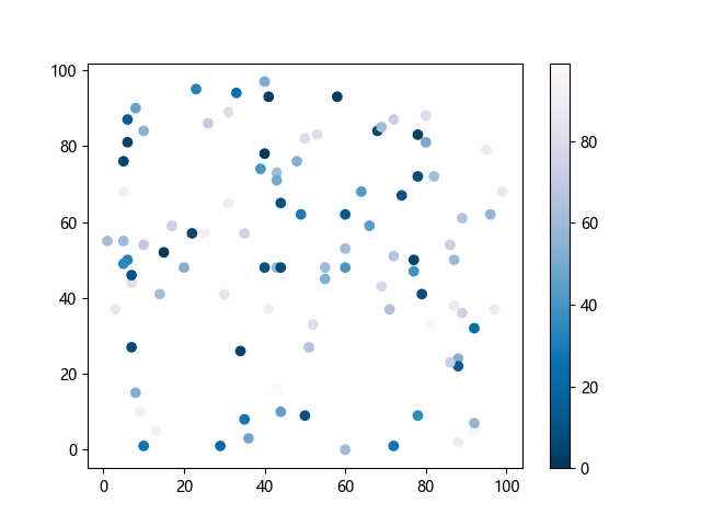 # 这三行代码使编译器能够绘图: import sys import matplotlib matplotlib.use('Agg') import matplotlib.pyplot as plt import numpy as np # 生成随机数据: x = np.random.randint(100, size=(100)) y = np.random.randint(100, size=(100)) colors = np.random.randint(100, size=(100)) # 使用 PuBu_r 配色方案绘制紫蓝色反向渐变色散点图: plt.scatter(x, y, c=colors, cmap='PuBu_r') plt.colorbar() # 显示颜色条 plt.show() # 显示图形 # 这两行代码使编译器能够输出图形: plt.savefig(sys.stdout.buffer) sys.stdout.flush()