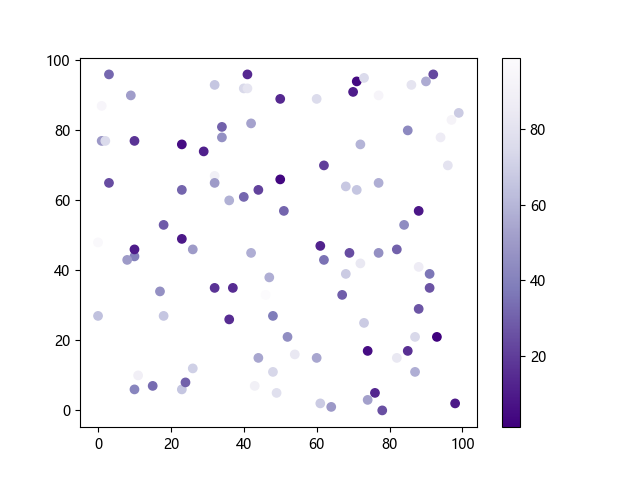 # 这三行代码使编译器能够绘图: import sys import matplotlib matplotlib.use('Agg') import matplotlib.pyplot as plt import numpy as np # 生成随机数据: x = np.random.randint(100, size=(100)) y = np.random.randint(100, size=(100)) colors = np.random.randint(100, size=(100)) # 使用 Purples_r 配色方案绘制紫色反向渐变色散点图: plt.scatter(x, y, c=colors, cmap='Purples_r') plt.colorbar() # 显示颜色条 plt.show() # 显示图形 # 这两行代码使编译器能够输出图形: plt.savefig(sys.stdout.buffer) sys.stdout.flush()