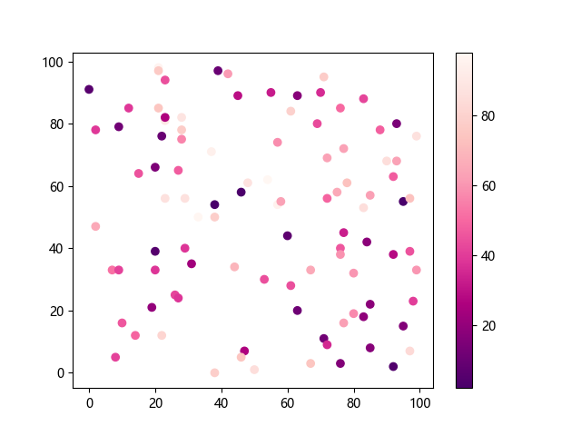 # 这三行代码使编译器能够绘图: import sys import matplotlib matplotlib.use('Agg') import matplotlib.pyplot as plt import numpy as np # 生成随机数据: x = np.random.randint(100, size=(100)) y = np.random.randint(100, size=(100)) colors = np.random.randint(100, size=(100)) # 使用 RdPu_r 配色方案绘制红紫色反向渐变色散点图: plt.scatter(x, y, c=colors, cmap='RdPu_r') plt.colorbar() # 显示颜色条 plt.show() # 显示图形 # 这两行代码使编译器能够输出图形: plt.savefig(sys.stdout.buffer) sys.stdout.flush()