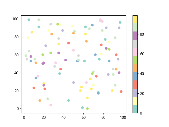 # 这三行代码使编译器能够绘图: import sys import matplotlib matplotlib.use('Agg') import matplotlib.pyplot as plt import numpy as np # 生成随机数据: x = np.random.randint(100, size=(100)) y = np.random.randint(100, size=(100)) colors = np.random.randint(100, size=(100)) # 使用 Set3 (12 色调色板)配色方案绘制 Set3 离散色散点图: plt.scatter(x, y, c=colors, cmap='Set3') plt.colorbar() # 显示颜色条 plt.show() # 显示图形 # 这两行代码使编译器能够输出图形: plt.savefig(sys.stdout.buffer) sys.stdout.flush()