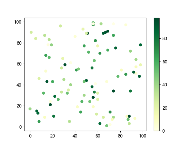 # 这三行代码使编译器能够绘图: import sys import matplotlib matplotlib.use('Agg') import matplotlib.pyplot as plt import numpy as np # 生成随机数据: x = np.random.randint(100, size=(100)) y = np.random.randint(100, size=(100)) colors = np.random.randint(100, size=(100)) # 使用 YlGn (黄-绿渐变)配色方案绘制散点图: plt.scatter(x, y, c=colors, cmap='YlGn') plt.colorbar() # 显示颜色条 plt.show() # 显示图形 # 这两行代码使编译器能够输出图形: plt.savefig(sys.stdout.buffer) sys.stdout.flush()