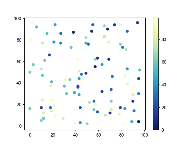 # 这三行代码使编译器能够绘图: import sys import matplotlib matplotlib.use('Agg') import matplotlib.pyplot as plt import numpy as np # 生成随机数据点: x = np.random.randint(100, size=(100)) y = np.random.randint(100, size=(100)) colors = np.random.randint(100, size=(100)) # 使用 YlGnBu_r (黄-绿-蓝反向渐变)配色方案绘制散点图: plt.scatter(x, y, c=colors, cmap='YlGnBu_r') plt.colorbar() # 显示颜色条 plt.show() # 显示图形 # 这两行代码使编译器能够输出图形: plt.savefig(sys.stdout.buffer) sys.stdout.flush()