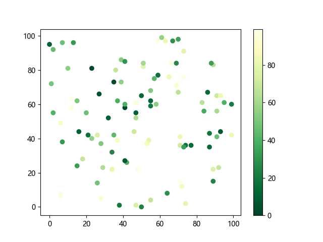 # 这三行代码使编译器能够绘图: import sys import matplotlib matplotlib.use('Agg') import matplotlib.pyplot as plt import numpy as np # 生成随机数据: x = np.random.randint(100, size=(100)) y = np.random.randint(100, size=(100)) colors = np.random.randint(100, size=(100)) # 使用YlGn_r(黄-绿反向渐变)配色方案绘制散点图: plt.scatter(x, y, c=colors, cmap='YlGn_r') plt.colorbar() # 显示颜色条 plt.show() # 显示图形 # 这两行代码使编译器能够输出图形: plt.savefig(sys.stdout.buffer) sys.stdout.flush()