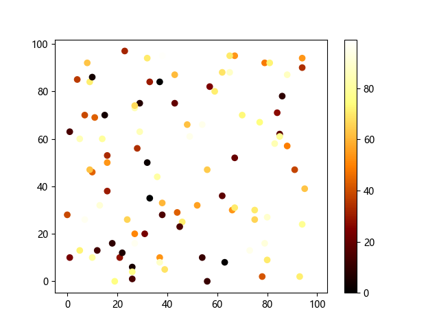 # 这三行代码使编译器能够绘图: import sys import matplotlib matplotlib.use('Agg') import matplotlib.pyplot as plt import numpy as np # 生成随机数据: x = np.random.randint(100, size=(100)) y = np.random.randint(100, size=(100)) colors = np.random.randint(100, size=(100)) # 使用 afmhot (热金属)配色方案绘制热金属色散点图: plt.scatter(x, y, c=colors, cmap='afmhot') plt.colorbar() # 显示颜色条 plt.show() # 显示图形 # 这两行代码使编译器能够输出图形: plt.savefig(sys.stdout.buffer) sys.stdout.flush()