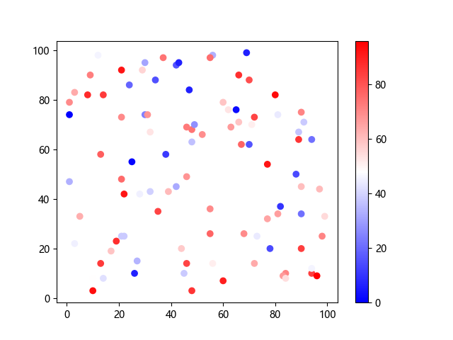 # 这三行代码使编译器能够绘图: import sys import matplotlib matplotlib.use('Agg') import matplotlib.pyplot as plt import numpy as np # 生成随机数据 x = np.random.randint(100, size=(100)) y = np.random.randint(100, size=(100)) colors = np.random.randint(100, size=(100)) # 使用 bwr 配色方案绘制蓝白红渐变色散点图: plt.scatter(x, y, c=colors, cmap='bwr') plt.colorbar() plt.show() # 这两行代码使编译器能够输出图形: plt.savefig(sys.stdout.buffer) sys.stdout.flush()