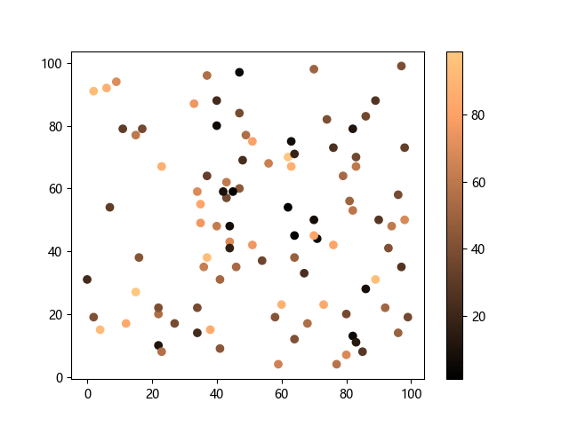 # 这三行代码使编译器能够绘图: import sys import matplotlib matplotlib.use('Agg') import matplotlib.pyplot as plt import numpy as np # 生成随机数据 x = np.random.randint(100, size=(100)) y = np.random.randint(100, size=(100)) colors = np.random.randint(100, size=(100)) # 使用 copper 配色方案绘制铜色渐变色散点图: plt.scatter(x, y, c=colors, cmap='copper') plt.colorbar() plt.show() # 这两行代码使编译器能够输出图形: plt.savefig(sys.stdout.buffer) sys.stdout.flush()