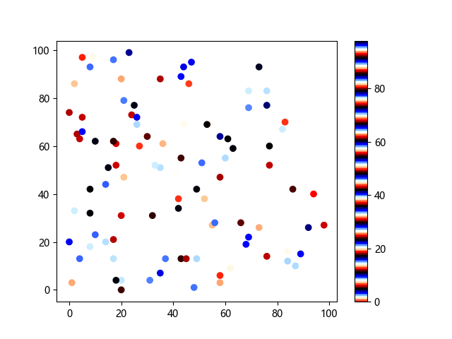 # 这三行代码使编译器能够绘图: import sys import matplotlib matplotlib.use('Agg') import matplotlib.pyplot as plt import numpy as np # 生成随机数据 x = np.random.randint(100, size=(100)) y = np.random.randint(100, size=(100)) colors = np.random.randint(100, size=(100)) # 使用 flag 配色方案绘制旗帜渐变色散点图: plt.scatter(x, y, c=colors, cmap='flag') plt.colorbar() plt.show() # 这两行代码使编译器能够输出图形: plt.savefig(sys.stdout.buffer) sys.stdout.flush()