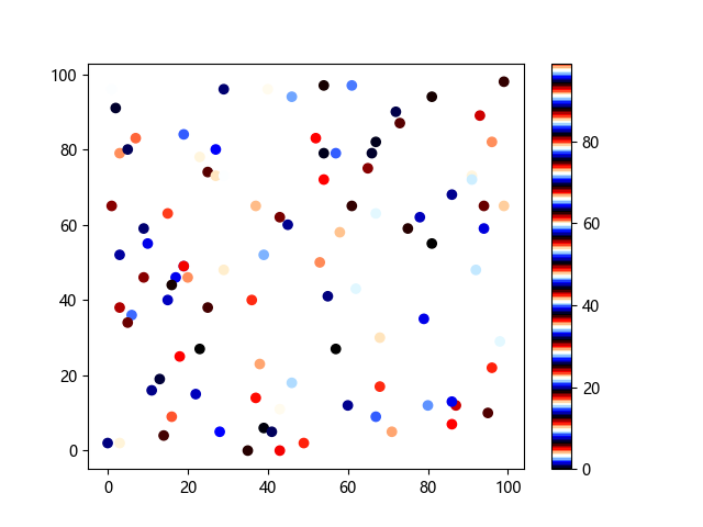 # 这三行代码使编译器能够绘图: import sys import matplotlib matplotlib.use('Agg') import matplotlib.pyplot as plt import numpy as np # 生成随机数据点 x = np.random.randint(100, size=(100)) y = np.random.randint(100, size=(100)) colors = np.random.randint(100, size=(100)) # 使用 flag_r 配色方案绘制旗帜反向渐变色散点图: plt.scatter(x, y, c=colors, cmap='flag_r') plt.colorbar() plt.show() # 这两行代码使编译器能够输出图形: plt.savefig(sys.stdout.buffer) sys.stdout.flush()