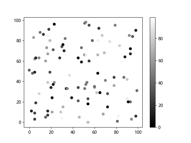 # 这三行代码使编译器能够绘图: import sys import matplotlib matplotlib.use('Agg') import matplotlib.pyplot as plt import numpy as np # 生成随机数据 x = np.random.randint(100, size=(100)) y = np.random.randint(100, size=(100)) colors = np.random.randint(100, size=(100)) # 使用 gist_gray 配色方案绘制灰度渐变色散点图: plt.scatter(x, y, c=colors, cmap='gist_gray') plt.colorbar() plt.show() # 这两行代码使编译器能够输出图形: plt.savefig(sys.stdout.buffer) sys.stdout.flush()