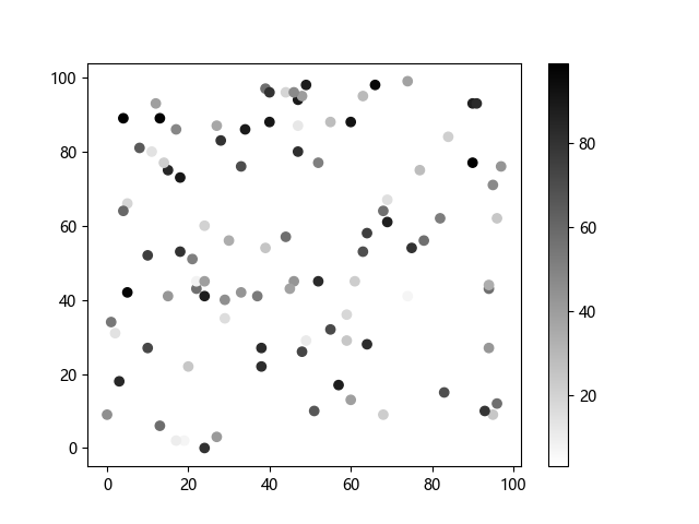 # 这三行代码使编译器能够绘图: import sys import matplotlib matplotlib.use('Agg') import matplotlib.pyplot as plt import numpy as np # 生成随机数据点 x = np.random.randint(100, size=(100)) y = np.random.randint(100, size=(100)) colors = np.random.randint(100, size=(100)) # 使用 gist_gray_r 配色方案绘制灰度反向渐变色散点图: plt.scatter(x, y, c=colors, cmap='gist_gray_r') plt.colorbar() plt.show() # 这两行代码使编译器能够输出图形: plt.savefig(sys.stdout.buffer) sys.stdout.flush()
