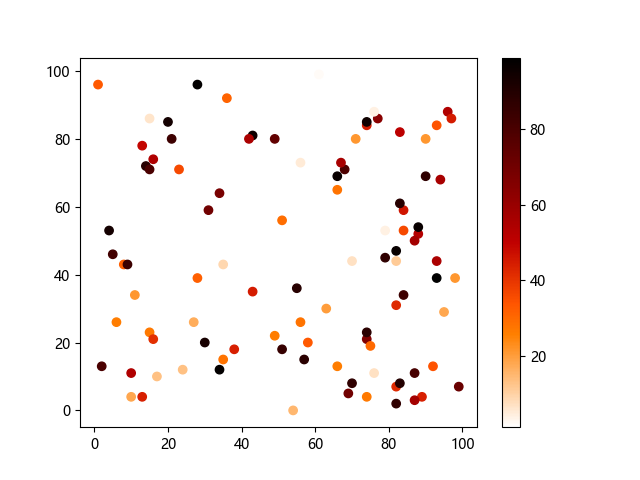 # 这三行代码使编译器能够绘图: import sys import matplotlib matplotlib.use('Agg') import matplotlib.pyplot as plt import numpy as np # 生成随机数据点 x = np.random.randint(100, size=(100)) y = np.random.randint(100, size=(100)) colors = np.random.randint(100, size=(100)) # 使用 gist_heat_r 配色方案绘制热力图反向渐变色散点图: plt.scatter(x, y, c=colors, cmap='gist_heat_r') plt.colorbar() plt.show() # 这两行代码使编译器能够输出图形: plt.savefig(sys.stdout.buffer) sys.stdout.flush()