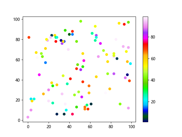 # 这三行代码使编译器能够绘图: import sys import matplotlib matplotlib.use('Agg') import matplotlib.pyplot as plt import numpy as np # 生成随机数据 x = np.random.randint(100, size=(100)) y = np.random.randint(100, size=(100)) colors = np.random.randint(100, size=(100)) # 使用 gist_ncar 配色方案绘制NCAR渐变色散点图: plt.scatter(x, y, c=colors, cmap='gist_ncar') plt.colorbar() plt.show() # 这两行代码使编译器能够输出图形: plt.savefig(sys.stdout.buffer) sys.stdout.flush()