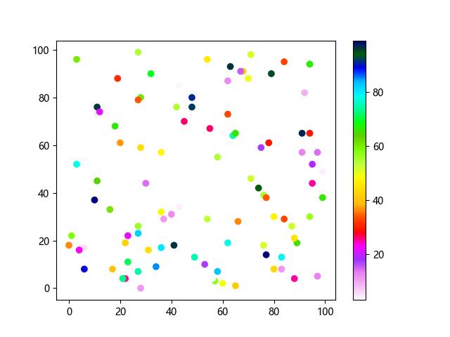 # 这三行代码使编译器能够绘图: import sys import matplotlib matplotlib.use('Agg') import matplotlib.pyplot as plt import numpy as np # 生成随机数据点 x = np.random.randint(100, size=(100)) y = np.random.randint(100, size=(100)) colors = np.random.randint(100, size=(100)) # 使用 gist_ncar_r 配色方案绘制 NCAR 反向渐变色散点图: plt.scatter(x, y, c=colors, cmap='gist_ncar_r') plt.colorbar() plt.show() # 这两行代码使编译器能够输出图形: plt.savefig(sys.stdout.buffer) sys.stdout.flush()
