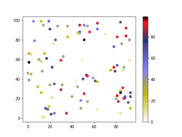 # 这三行代码使编译器能够绘图: import sys import matplotlib matplotlib.use('Agg') import matplotlib.pyplot as plt import numpy as np # 生成随机数据点 x = np.random.randint(100, size=(100)) y = np.random.randint(100, size=(100)) colors = np.random.randint(100, size=(100)) # 使用 gist_stern_r 配色方案绘制星云反向渐变色散点图: plt.scatter(x, y, c=colors, cmap='gist_stern_r') plt.colorbar() plt.show() # 这两行代码使编译器能够输出图形: plt.savefig(sys.stdout.buffer) sys.stdout.flush()