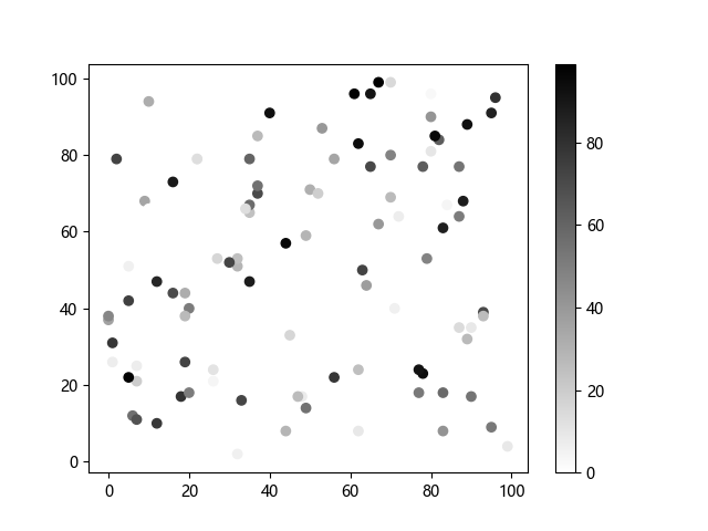 # 这三行代码使编译器能够绘图: import sys import matplotlib matplotlib.use('Agg') import matplotlib.pyplot as plt import numpy as np # 生成随机数据 x = np.random.randint(100, size=(100)) y = np.random.randint(100, size=(100)) colors = np.random.randint(100, size=(100)) # 使用 gist_yarg 配色方案绘制灰度渐变色散点图: plt.scatter(x, y, c=colors, cmap='gist_yarg') plt.colorbar() plt.show() # 这两行代码使编译器能够输出图形: plt.savefig(sys.stdout.buffer) sys.stdout.flush()