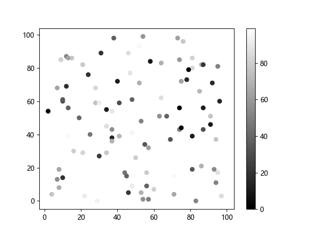 # 这三行代码使编译器能够绘图: import sys import matplotlib matplotlib.use('Agg') import matplotlib.pyplot as plt import numpy as np # 生成随机数据点 x = np.random.randint(100, size=(100)) y = np.random.randint(100, size=(100)) colors = np.random.randint(100, size=(100)) # 使用 gist_yarg_r 配色方案绘制灰度反向渐变色散点图: plt.scatter(x, y, c=colors, cmap='gist_yarg_r') plt.colorbar() plt.show() # 这两行代码使编译器能够输出图形: plt.savefig(sys.stdout.buffer) sys.stdout.flush()