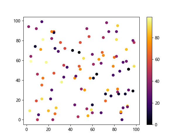 # 这三行代码使编译器能够绘图: import sys import matplotlib matplotlib.use('Agg') import matplotlib.pyplot as plt import numpy as np # 生成随机数据 x = np.random.randint(100, size=(100)) y = np.random.randint(100, size=(100)) colors = np.random.randint(100, size=(100)) # 使用 inferno 配色方案绘制地狱火渐变色散点图: plt.scatter(x, y, c=colors, cmap='inferno') plt.colorbar() plt.show() # 这两行代码使编译器能够输出图形: plt.savefig(sys.stdout.buffer) sys.stdout.flush()