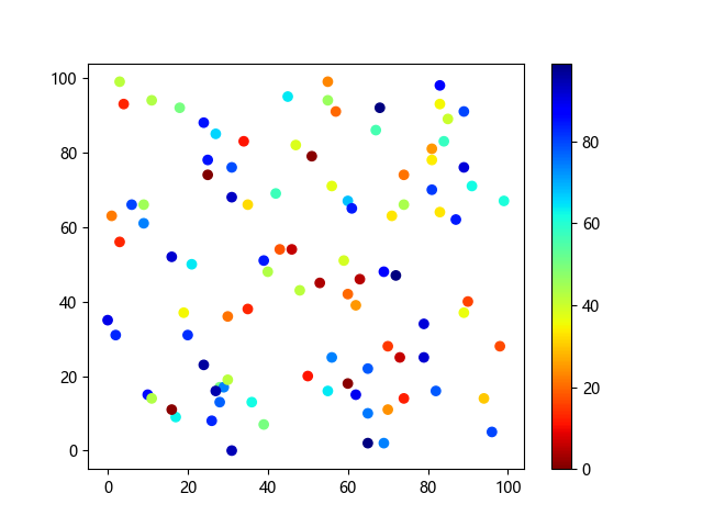 # 这三行代码使编译器能够绘图: import sys import matplotlib matplotlib.use('Agg') import matplotlib.pyplot as plt import numpy as np # 生成随机数据点 x = np.random.randint(100, size=(100)) y = np.random.randint(100, size=(100)) colors = np.random.randint(100, size=(100)) # 使用 jet_r 配色方案绘制 Jet 反向渐变色散点图: plt.scatter(x, y, c=colors, cmap='jet_r') plt.colorbar() plt.show() # 这两行代码使编译器能够输出图形: plt.savefig(sys.stdout.buffer) sys.stdout.flush()