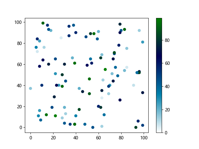 # 这三行代码使编译器能够绘图: import sys import matplotlib matplotlib.use('Agg') import matplotlib.pyplot as plt import numpy as np # 生成随机数据点 x = np.random.randint(100, size=(100)) y = np.random.randint(100, size=(100)) colors = np.random.randint(100, size=(100)) # 使用 ocean_r 配色方案绘制海洋色反向渐变色散点图: plt.scatter(x, y, c=colors, cmap='ocean_r') plt.colorbar() plt.show() # 这两行代码使编译器能够输出图形: plt.savefig(sys.stdout.buffer) sys.stdout.flush()