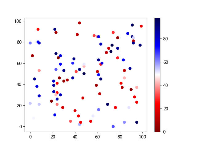 # 以下三行代码使编译器支持绘图功能: import sys import matplotlib matplotlib.use('Agg') import matplotlib.pyplot as plt import numpy as np # 生成随机数据: x = np.random.randint(100, size=(100)) y = np.random.randint(100, size=(100)) colors = np.random.randint(100, size=(100)) # 使用 seismic 反向配色方案创建散点图: plt.scatter(x, y, c=colors, cmap='seismic_r') plt.colorbar() plt.show() # 以下两行代码使编译器能够输出图形: plt.savefig(sys.stdout.buffer) sys.stdout.flush()