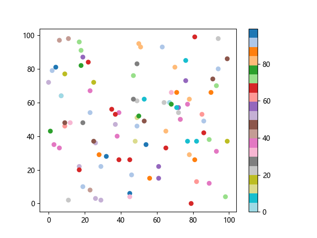# 以下三行代码使编译器支持绘图功能: import sys import matplotlib matplotlib.use('Agg') import matplotlib.pyplot as plt import numpy as np # 生成随机数据: x = np.random.randint(100, size=(100)) y = np.random.randint(100, size=(100)) colors = np.random.randint(100, size=(100)) # 使用 tab20 反向离散配色方案创建散点图: plt.scatter(x, y, c=colors, cmap='tab20_r') plt.colorbar() plt.show() # 以下两行代码使编译器能够输出图形: plt.savefig(sys.stdout.buffer) sys.stdout.flush()