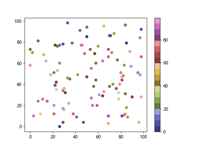 # 以下三行代码使编译器支持绘图功能: import sys import matplotlib matplotlib.use('Agg') import matplotlib.pyplot as plt import numpy as np # 生成随机数据: x = np.random.randint(100, size=(100)) y = np.random.randint(100, size=(100)) colors = np.random.randint(100, size=(100)) # 使用 tab20b 离散配色方案创建散点图: plt.scatter(x, y, c=colors, cmap='tab20b') plt.colorbar() plt.show() # 以下两行代码使编译器能够输出图形: plt.savefig(sys.stdout.buffer) sys.stdout.flush()