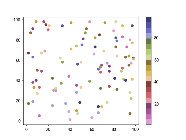# 以下三行代码使编译器支持绘图功能: import sys import matplotlib matplotlib.use('Agg') import matplotlib.pyplot as plt import numpy as np # 生成随机数据: x = np.random.randint(100, size=(100)) y = np.random.randint(100, size=(100)) colors = np.random.randint(100, size=(100)) # 使用 tab20b 反向离散配色方案创建散点图: plt.scatter(x, y, c=colors, cmap='tab20b_r') plt.colorbar() plt.show() # 以下两行代码使编译器能够输出图形: plt.savefig(sys.stdout.buffer) sys.stdout.flush()