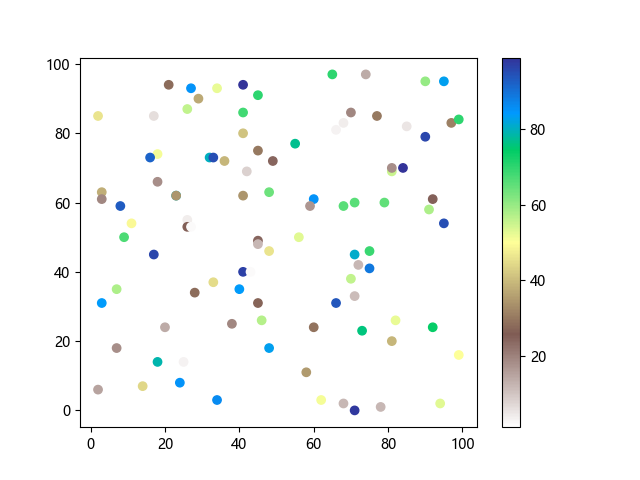 # 以下三行代码使编译器支持绘图功能: import sys import matplotlib matplotlib.use('Agg') import matplotlib.pyplot as plt import numpy as np # 生成随机数据: x = np.random.randint(100, size=(100)) y = np.random.randint(100, size=(100)) colors = np.random.randint(100, size=(100)) # 使用地形反向 (terrain_r) 配色方案创建散点图: plt.scatter(x, y, c=colors, cmap='terrain_r') plt.colorbar() plt.show() # 以下两行代码使编译器能够输出图形: plt.savefig(sys.stdout.buffer) sys.stdout.flush()