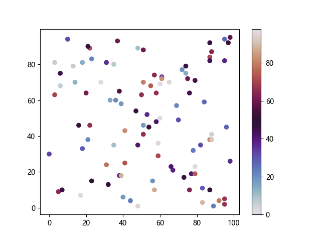 # 以下三行代码使编译器支持绘图功能: import sys import matplotlib matplotlib.use('Agg') import matplotlib.pyplot as plt import numpy as np # 生成随机数据: x = np.random.randint(100, size=(100)) y = np.random.randint(100, size=(100)) colors = np.random.randint(100, size=(100)) # 使用 twilight 配色方案创建散点图: plt.scatter(x, y, c=colors, cmap='twilight') plt.colorbar() plt.show() # 以下两行代码使编译器能够输出图形: plt.savefig(sys.stdout.buffer) sys.stdout.flush()