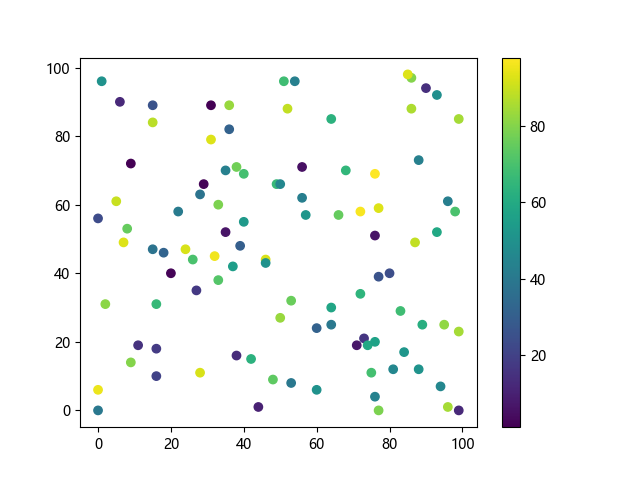# 以下三行代码使编译器支持绘图功能: import sys import matplotlib matplotlib.use('Agg') import matplotlib.pyplot as plt import numpy as np # 生成随机数据: x = np.random.randint(100, size=(100)) y = np.random.randint(100, size=(100)) colors = np.random.randint(100, size=(100)) # 使用 viridis 配色方案创建散点图: plt.scatter(x, y, c=colors, cmap='viridis') plt.colorbar() plt.show() # 以下两行代码使编译器能够输出图形: plt.savefig(sys.stdout.buffer) sys.stdout.flush()