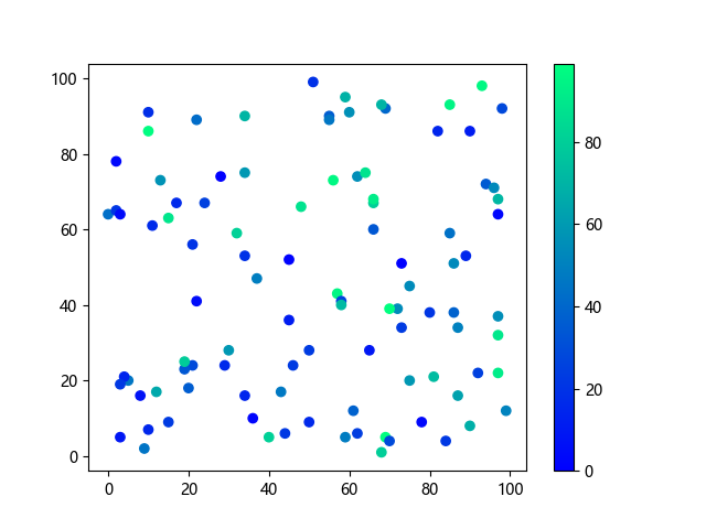 # 以下三行代码使编译器支持绘图功能: import sys import matplotlib matplotlib.use('Agg') import matplotlib.pyplot as plt import numpy as np # 生成随机数据: x = np.random.randint(100, size=(100)) y = np.random.randint(100, size=(100)) colors = np.random.randint(100, size=(100)) # 使用冬季 (winter) 配色方案创建散点图: plt.scatter(x, y, c=colors, cmap='winter') plt.colorbar() plt.show() # 以下两行代码使编译器能够输出图形: plt.savefig(sys.stdout.buffer) sys.stdout.flush()