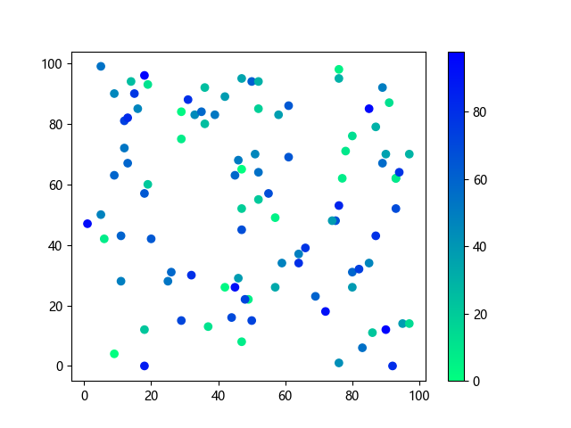 # 以下三行代码使编译器支持绘图功能: import sys import matplotlib matplotlib.use('Agg') import matplotlib.pyplot as plt import numpy as np # 生成随机数据: x = np.random.randint(100, size=(100)) y = np.random.randint(100, size=(100)) colors = np.random.randint(100, size=(100)) # 使用冬季反向 (winter_r) 配色方案创建散点图: plt.scatter(x, y, c=colors, cmap='winter_r') plt.colorbar() plt.show() # 以下两行代码使编译器能够输出图形: plt.savefig(sys.stdout.buffer) # 将图形保存到标准输出缓冲区 sys.stdout.flush() # 刷新输出缓冲区